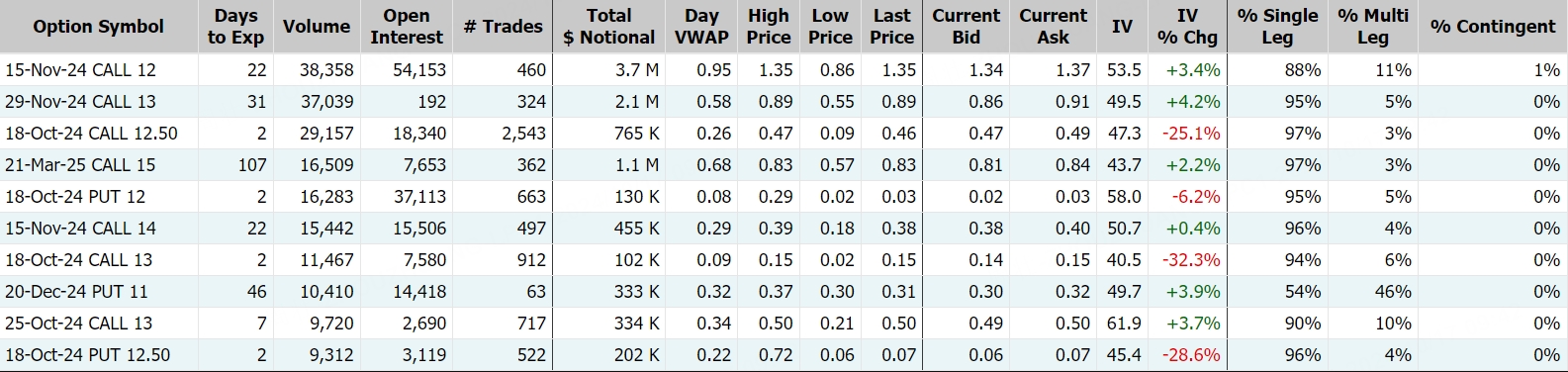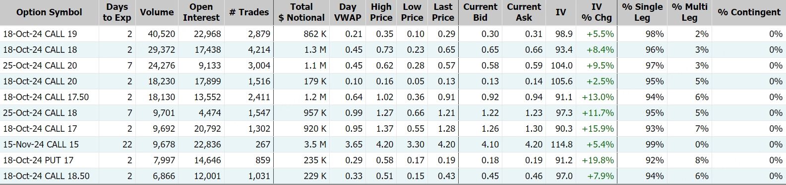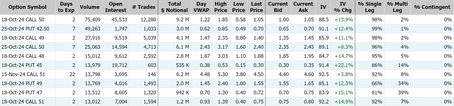 超微电脑隔夜收涨2%,公司宣布推出新的人工智能服务器,采用英伟达最新的Blackwell系列处理器。期权方面,超微电脑当日成交75.16万张合约,环比前一交易日增长110%,看涨期权占比65.7%,其中于本周五到期的50美元行使价的看涨期权成交居前,成交7.54万张。 $SMCI 20241018 50.0 CALL$
