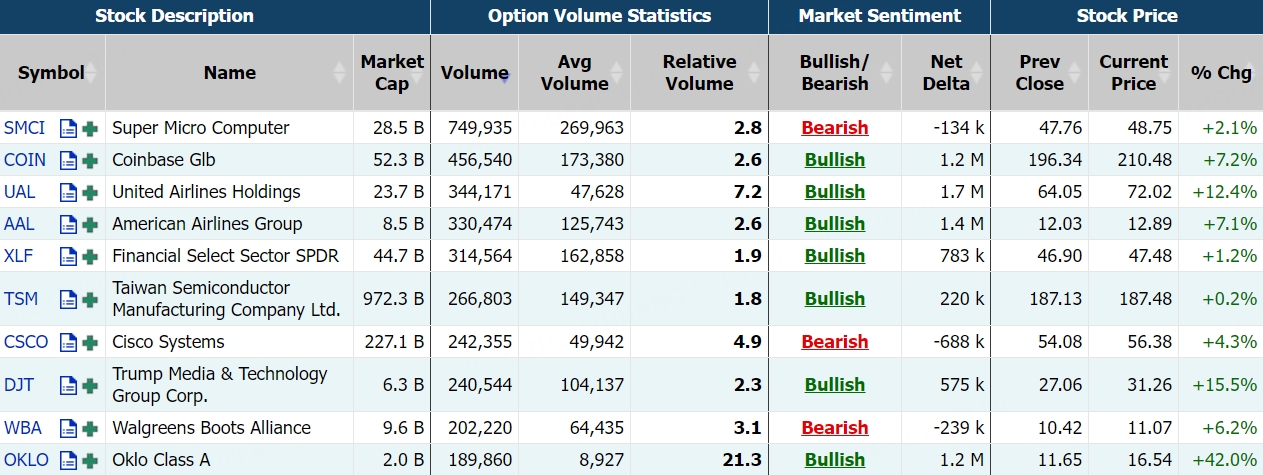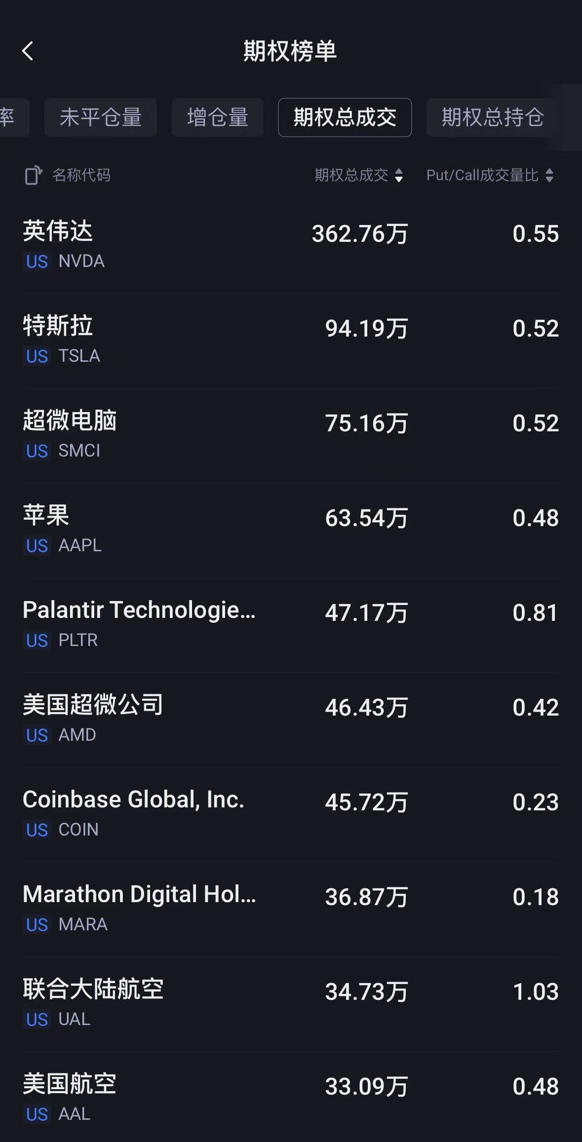 周三,期权市场总成交量3959.1万张合约,低于90日均量;英伟达成交362.76万张,其中多张本周五到期的看涨期权翻倍大涨;Coinbase、Marathon Digital期权成交量大幅上涨,看涨期权占比均超80%>>