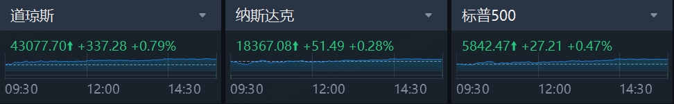 美东时间周三,美股三大指数集体收涨,截至收盘,道指涨337.28点,涨幅为0.79%,报43077.70点;纳指涨51.49点,涨幅为0.28%,报18367.08点;标普500指数涨27.21点,涨幅为0.47%,报5842.47点。