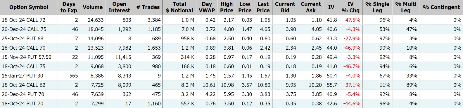 期权方面,联合大陆航空当日成交34.42万张合约,美国航空成交33.05万张合约,环比前一交易日均翻倍,看涨期权占比大幅攀升;其中联合大陆航空于10月18日到期的72美元行使价的看涨期权成交居前,成交2.46万张;美国航空于11月15日到期的12美元行使价的看涨期权成交居前,成交3.84万张。 $UAL 20241018 72.0 CALL$ $AAL 20241115 12.0 CALL$