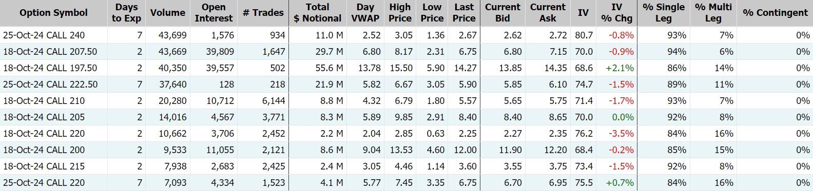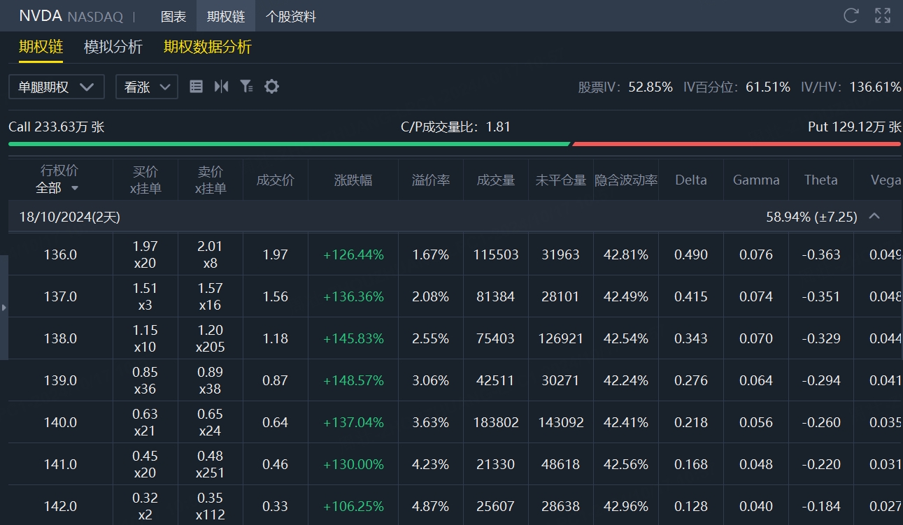 英伟达隔夜收涨逾3%,“索罗斯战友”Druckenmiller表示,清仓英伟达是重大错误,股价下跌将再买入。期权方面,英伟达当日成交362.76万张合约,环比前一交易日有所下降,看涨期权占比64.4%,其中于本周五到期的135美元到140美元行使价的看涨期权成交居前,多张本周五到期的看涨期权翻倍大涨。 $NVDA 20241018 135.0 CALL$ $NVDA 20241018 140.0 CALL$
