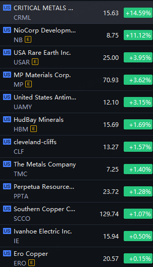 Rare Earth Stocks Rebound. Critical Metals up 14%; NioCorp up 11%; USA Rare Earth, MP and UAMY up 3%.