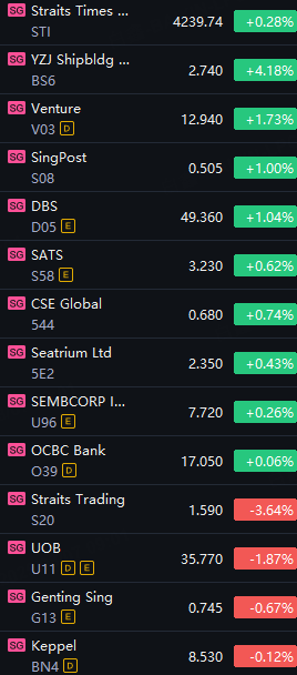 Yangzijiang Shipbuilding : The mainboard-listed shipbuilder on Wednesday reported net profit of 4.2 billion yuan (S$752.6 million) for the six months ended Jun 30, a record-high for the group and a 36.7 per cent surge from 3.1 billion yuan for the same period the year prior. Revenue declined 1.3 per cent year on year for H1 FY2025, to 12.9 billion yuan, however. The company’s net profit margin rose to 32.5 per cent, from 23.4 per cent in the same year-ago period, and earnings per share increased to 1.0602 yuan from 0.7742 yuan. No dividend was declared for the period. The counter closed 2.3 per cent or S$0.06 up at S$2.63 on Wednesday, before the results were posted.