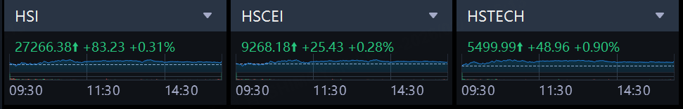 Hong Kong equities closed modestly higher, led by technology and resources. The Hang Seng Index (HSI) rose 0.31% to 27,266.38, the Hang Seng China Enterprises Index (HSCEI) gained 0.28% to 9,268.18, and the Hang Seng Tech Index (HSTECH) outperformed with a 0.90% rise to 5,499.99. The HSCCI added 0.57% to 4,432.29. Strength in gold miners, diversified metals, and construction materials offset weakness in pockets of healthcare and consumer sectors, while large-cap tech posted mixed but generally constructive moves.