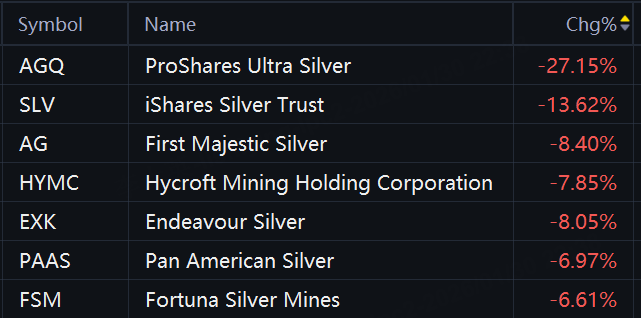 ProShares Ultra Silver fell 27%; iShares Silver Trust fell 14%; First Majestic Silver, Endeavour Silver, and Hycroft Mining fell 8%; Pan American Silver and Fortuna Silver Mines fell 7%.