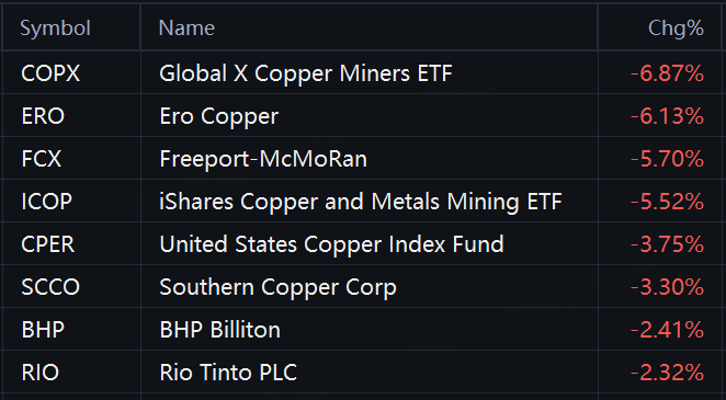 Global X Copper Miners ETF fell 7%; Ero Copper, Freeport-McMoRan, and iShares Copper and Metals Mining ETF fell 6%; United States Copper Index Fund fell 4%; Southern Copper fell 3%; BHP Billiton and Rio Tinto fell 2%.