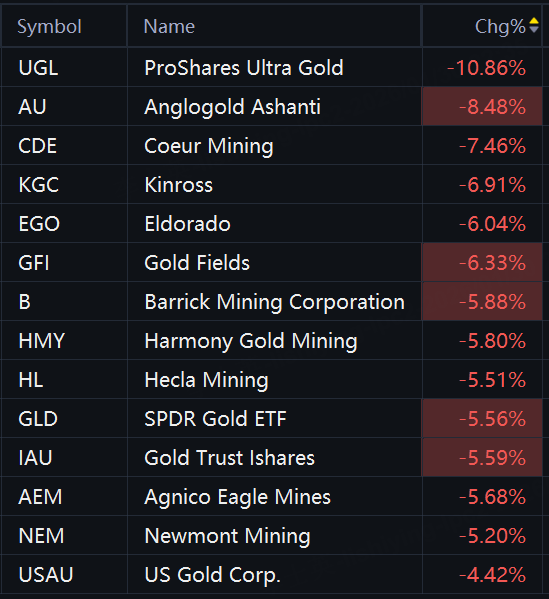 Gold, silver, copper stocks and ETFs dropped in morning trading. ProShares Ultra Gold fell 11%; Anglogold Ashanti fell 9%; Coeur Mining fell 8%; Kinross fell 7%; Gold Fields, Eldorado, Barrick Mining, Harmony Gold, Agnico Eagle Mines, Gold Trust Ishares, SPDR Gold ETF, and Hecla Mining fell 6%; Newmont fell 5%; US Gold Corp. fell 4%.