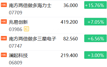 4月14日,港股存储概念盘初走高,南方两倍做多海力士涨超15%,兆易创新涨超7%,南方两倍做多三星电子、澜起科技跟涨。