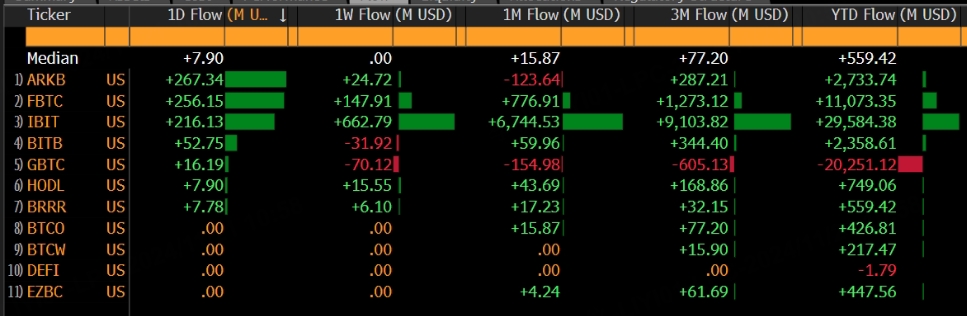 The Bitcoin spot ETF with the highest net inflow on November 20 was ARK 21Shares Bitcoin ETF, with a net inflow of $267.34 million. Following that was Fidelity Wise Origin Bitcoin Fund, with a net inflow of $256.15 million, according to Bloomberg data.