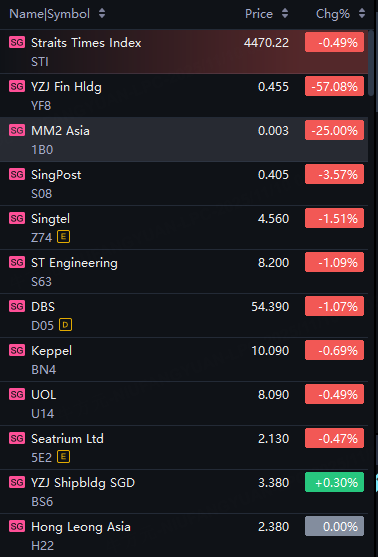 Singapore stocks opened lower on Monday. STI fell 0.5%; Yangzijiang Financial fell 57%; MM2 Asia fell 25%; SingPost fell 4%.