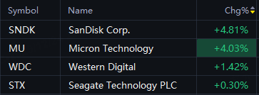 Chip storage stocks jumped in Wednesday trading. SanDisk up 5%; Micron up 4%; Western Digital up 1%.