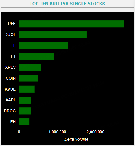 Top 10 bullish stocks: Pfizer, Duolingo, Inc., Ford, Energy Transfer LP, XPeng Inc., Coinbase Global, Inc., Kenvue Inc, Apple, Datadog, EHang Holdings Ltd