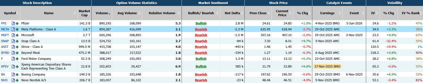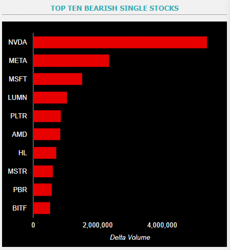 This report shows stocks with the highest volume of bullish and bearish activity by option delta volume, which converts option volume to an equivalent stock volume (bought or sold).