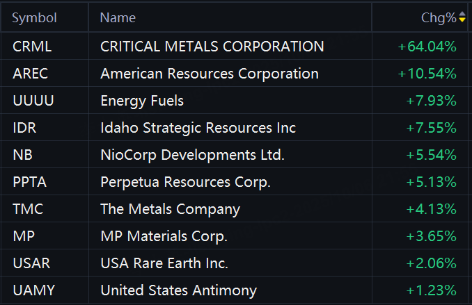 Rare earth stocks surged in morning trading on Monday. Critical Metals rose 64%; American Resources rose 11%; Energy Fuels and Idaho Strategic Resources rose 8%; NioCorp Developments rose 6%; Perpetua Resources rose 5%; The Metals Company and MP Materials rose 4%; USA Rare Earth rose 2%; United States Antimony rose 1%.