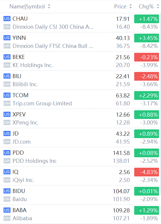 Chinese ADRs and ETFs continued to fall in overnight trading. CHAU, YINN sank more than 8%; KE Holdings fell nearly 4%; Bilibili, Trip.com fell over 3%.