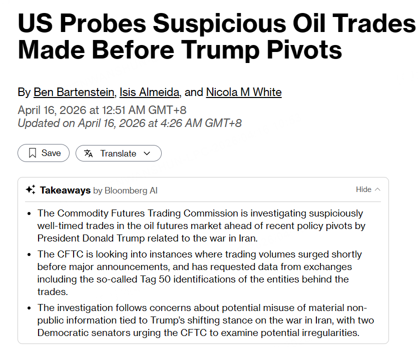 据外电,知情人士透露,美国最高衍生品监管机构——美国商品期货交易委员会(CFTC)正在调查一系列时机异常精准的石油期货交易,这些交易发生在特朗普近期就伊朗战争相关政策转向之前。