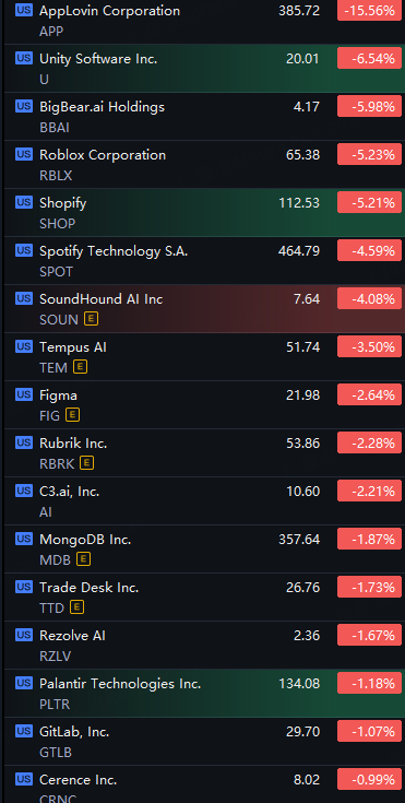 AI Software Shares Tumbled. AppLovin down 16%; Unity Down 7%; BigBear.ai, Roblox and Shopify Down 5%; Spotify, Tempus and SoundHound Down 4%.