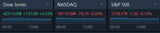 The Dow Jones Industrial Average rose 137.89 points, or 0.33%, to 42,313.00, the S&P 500 lost 7.20 points, or 0.13%, to 5,738.17 and the Nasdaq Composite lost 70.70 points, or 0.39%, to 18,119.59. Nvidia falls 2.1%, JD.com jumps 5%, PDD Holdings rises 4.6%, Alibaba up 2.2%.