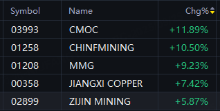 HK Movers | Copper Stocks Shine. CMOC up 12%; CHINFMINING up 11%; MMG up 9%; Jiangxi Copper up 7%