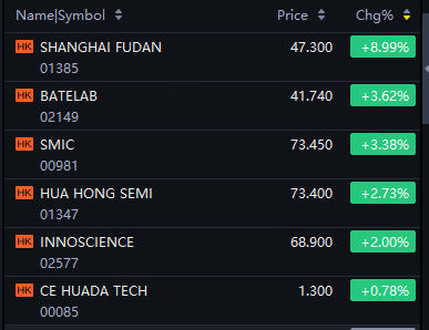 Hong Kong’s semiconductor stocks rose on Monday. Shanghai Fudan up 9%; Batelab up 4%; SMIC, Hua Hong Semi up 3%; CE Huada Tech up 1%.