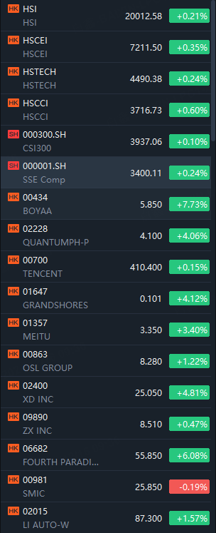 On December 16, 2024, the Hong Kong stock market opened higher. The Hang Seng Index (HSI) rose by 0.2%, the Hang Seng China Enterprises Index (HSCEI) rose by 0.35%, the Hang Seng Tech Index (HSTECH) rose by 0.2%, and the Hang Seng China-Affiliated Corporations Index (HSCCI) rose by 0.6%.