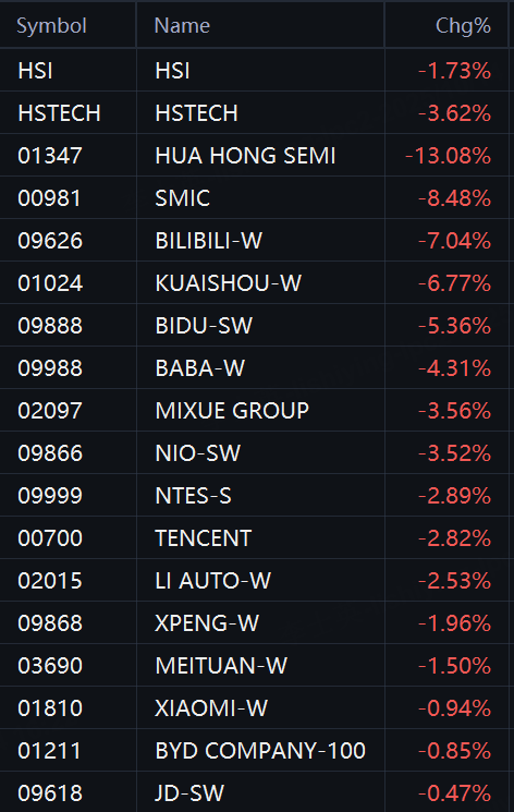 In terms of star stocks, Hua Hong Semiconductor fell 13%; SMIC fell 9%; Bilibili and Kusihou fell 7%; Baidu fell 5%; Alibaba, Mixue, and NIO fell 4%; NetEase, Tencent, and Li Auto fell 3%; XPeng and Meituan fell 2%; Xiaomi and BYD fell 0.9%; JD.com fell 0.5%.