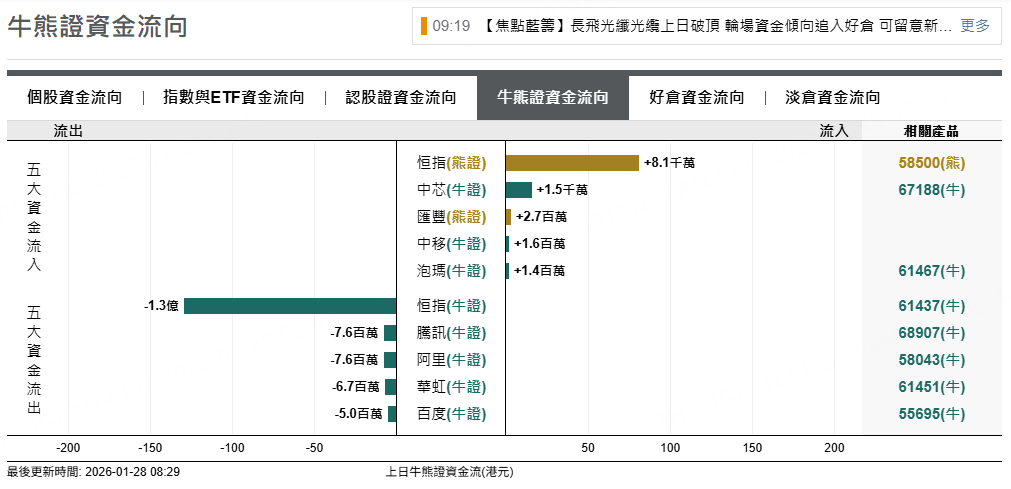 恒指熊證上日流入8100萬元,中芯牛證流入1500萬元,滙豐熊證流入270萬元。