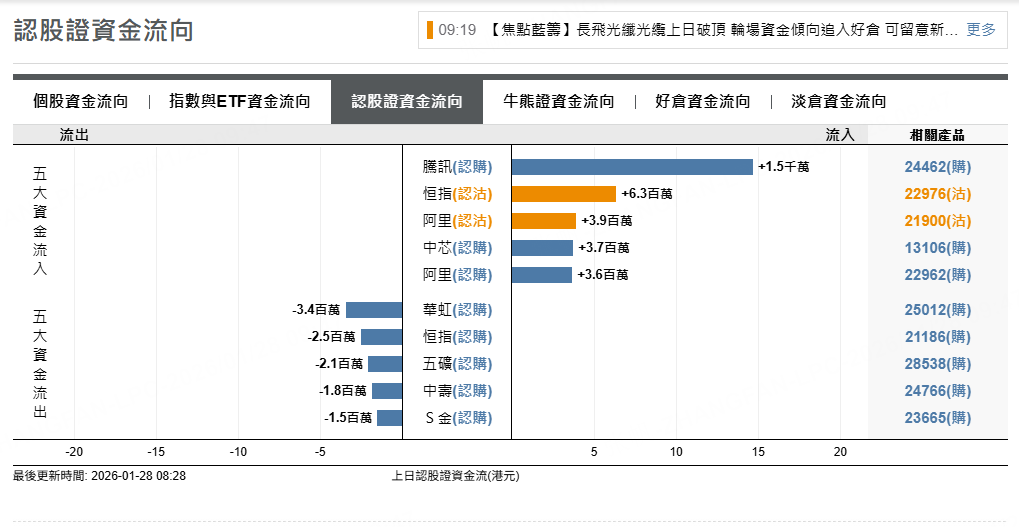 恒指牛證上日流出1.3億元,騰訊牛證上日流出760萬元,阿里牛證流出760萬元。