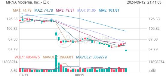 本周四(9月12日),生物科技巨头 Moderna, Inc. 盘初大跌超17%,截止发稿报65.41美元。