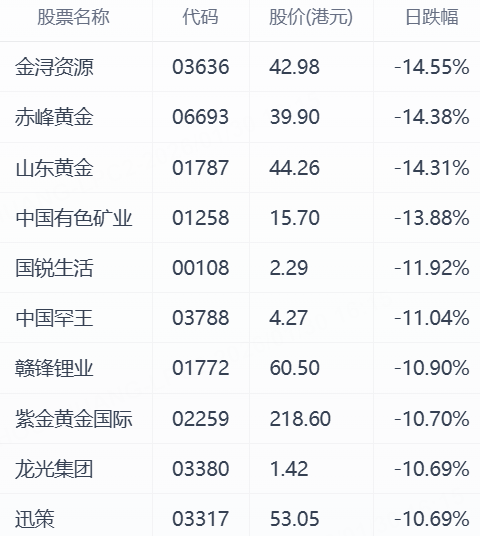 • 黄金板块:赤峰黄金跌14.38%,山东黄金跌14.31%,紫金黄金国际跌10.70%