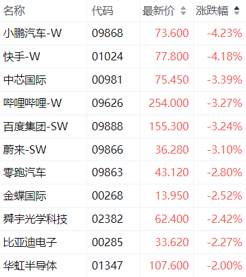 科指成分股中,快手-W、小鹏汽车-W跌超4%,中芯国际、哔哩哔哩-W、百度集团-SW、蔚来-SW跌超3%。