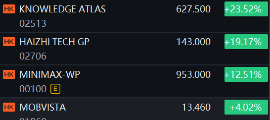 HK AI App Stocks Shined. Knowledge Atlas Up 24%; Haizhi Tech Up 19%; MiniMax Up 13%; Mobvista Up 4%.
