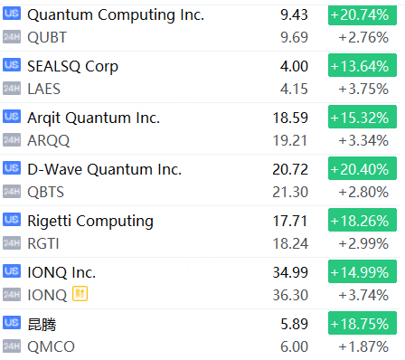 量子计算概念股夜盘普涨,ARQQ、LAES、IONQ涨超3%。RGTI、QBTS等跟涨。
