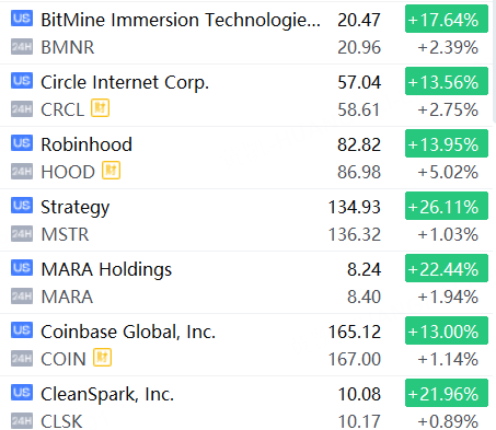 加密货币概念股上涨,Robinhood涨超5%,Circle、BitMine涨超2%,Coinbase、Strategy涨超1%。
