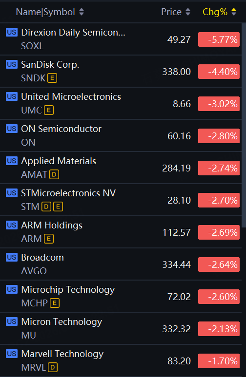 Chip stocks pulled back on Thursday. SOXL down 6%; SanDisk down over 4%; UMC, Onsemi down about 3%; Applied Materials, Broadcom, Micron down over 2%.