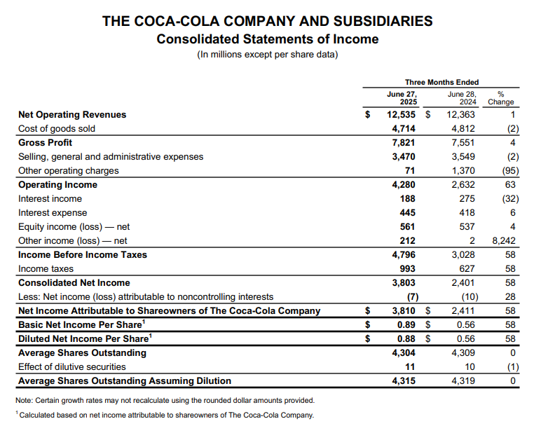 可口可乐公司第二季度净营收(GAAP)同比增长1%至125.4亿美元;调整后营收达126.2亿美元,超出市场预期的125.4亿美元,同比增长2.5%;调整后每股收益(EPS)为0.87美元,超出预期的0.83美元,同比增长4%;营业利润大幅增长63%,营业利润率跃升至34.1%,为近年来高点;零糖可乐(Coca-Cola Zero Sugar)销量增长14%,为四季度以来持续两位数增长;北美市场健怡可乐(Diet Coke)连续第四季度实现销量增长;蛋白质奶昔品牌在美表现强劲,顺应健康饮品消费趋势。