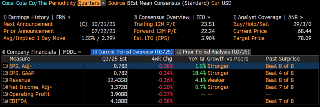 可口可乐将于10月21日发布2025年第三季度财报。根据彭博分析师预期,可口可乐第三季度营收124.3亿美元,同比增长4%;调整后净利润33.72亿美元,同比增长0.7%。