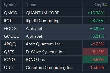 QMCO rose 16%; Rigetti Computing rose 9%; Alphabet rose 4%.