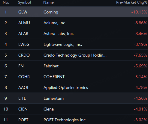 Optical Communication Stocks tumbled in premarket. Corning down 10%; Aeluma, Astera Labs, Credo and Lightwave down 8%; Farbinet And Coherent Down 5%.