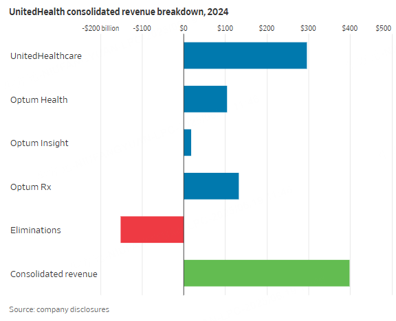 The Optum Health segment, for instance, showed $105 billion of revenue and $98 billion of operating costs in 2024. Financial disclosures offer no detail on how much it spent on medical care, staff or products—just a footnote saying it lumps all operating costs together.
