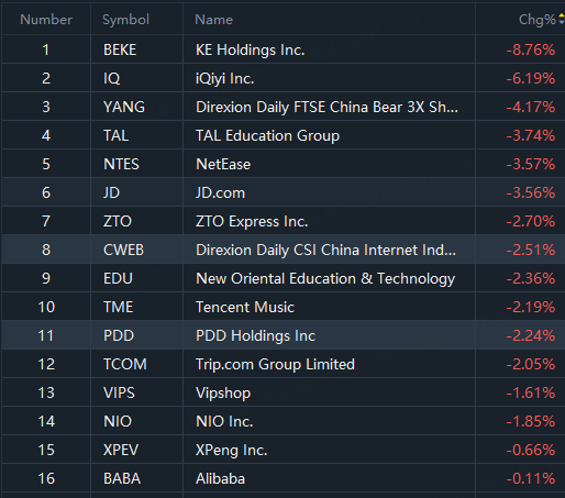 Chinese ADRs fell in morning trading. KE Holdings fell 9%; iQiyi fell 6.2%; JD.com fell 3.6%; PDD Holdings fell 2.2%; Nio fell 1.8%.