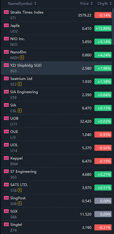 Singapore stocks opened lower on Tuesday. STI fell 0.1%; Japfa rose 14%; NIO rose 9%; Nanofilm rose 4.2%; YZJ Shipbldg rose 2%.