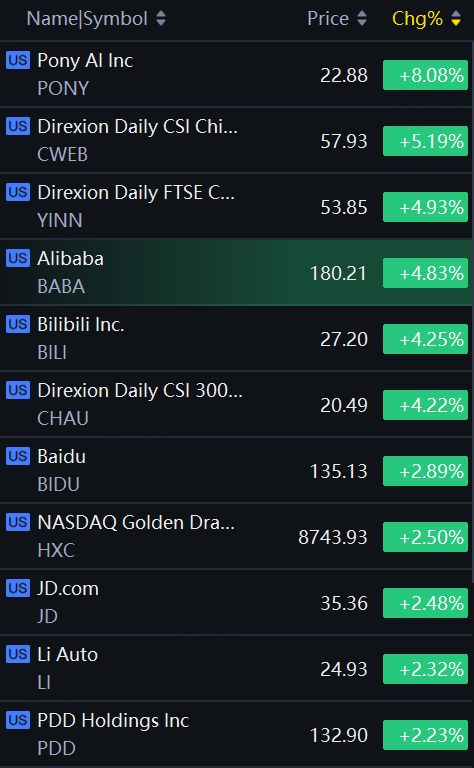 Chinese ADRs and ETFs jumped on Monday. Pony AI up 8%; CWEB, YINN, Alibaba up around 5%; Bilibili, CHAU up over 4%; JD.com, Li Auto, PDD up over 2%.