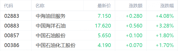港股异动 | 油气股走强,中海油田服务涨超4%,中国海洋石油涨超3%