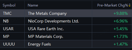 The Metals Company rose 10%; NioCorp rose 7%; USA Rare Earth rose 5%; MP Materials rose 2%.