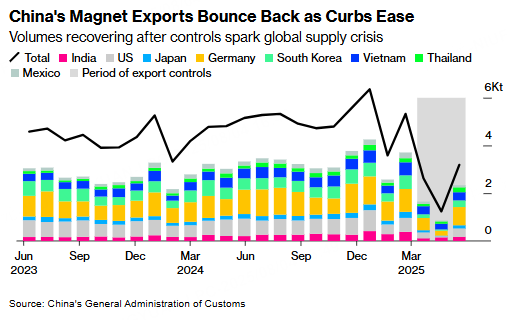 Flows of rare earth magnets from China to the US rose to 353 tons in June, up from just 46 tons in May, according to the latest customs data. Total shipments were still substantially lower than before Beijing launched export controls in early April.
