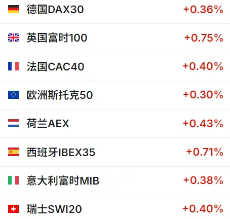 欧洲主要指数全线上涨,德国DAX30涨0.36%,英国富时100涨0.75%,法国CAC40涨0.4%。