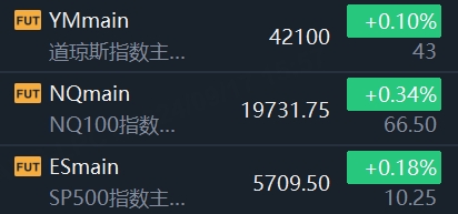 美股三大股指期货集体走高,截至发稿,道指期货涨0.1%,纳斯达克100指数期货涨0.34%,标普500指数期货涨0.18%。