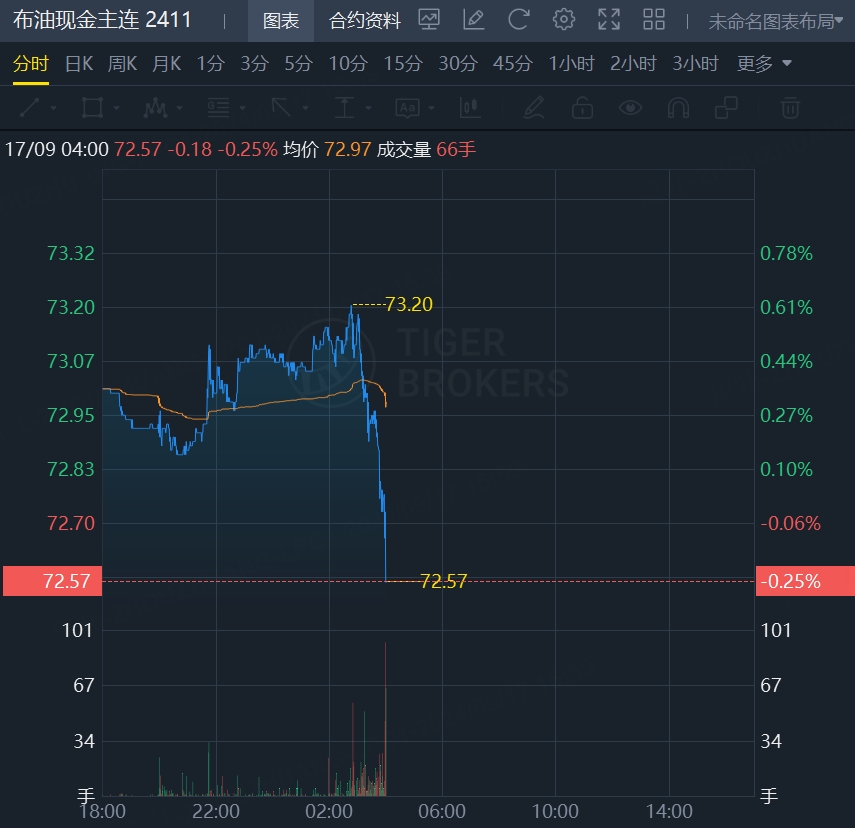 原油期货短线转跌,WTI原油报70.03美元/桶,跌0.09%;布油现报72.57美元/桶,跌0.25%。