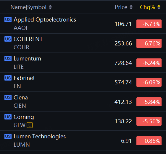Optical communication stocks fell on Thursday. Applied Optoelectronics, Coherent, Lumentum, Fabrinet down around 6%; Ciena, Corning down over 5%.